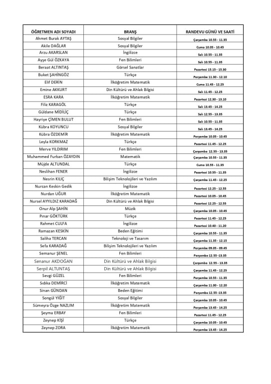 Biliyorsunuz ki öğretmenlerimiz okul saatleri içerisinde derslere girip, öğrencilerinizle ilgilenmektedir. Öğretmenlerimiz ile görüşmek istediğinizde hem diğer öğrencilerin sınıfta bekletilip ihmal edilmemesi hem de verimli görüşme yapılabilmesi adına öğretmenlerimizin boş saatlerine veli görüşme saatleri ayarladık. Görüşmek istediğiniz öğretmenin randevu gününe ve saatine dikkat ederek gelirseniz daha verimli bir görüşme sağlayabilirsiniz.